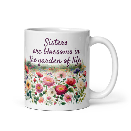 White Glossy Mug - Sisters are Blossoms in Garden of Life